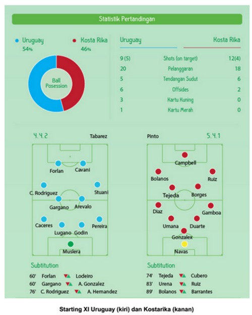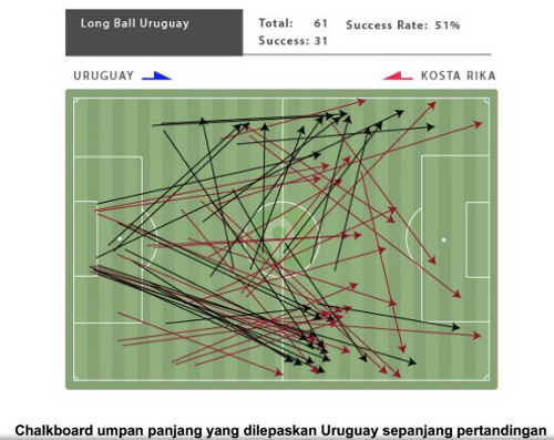 Sayangnya Uruguay seolah kehabisan akal untuk mencari pola serangan alternatif. Mereka hanya melepaskan bola-bola panjang yang monoton dan sangat mudah dipatahkan para pemain Kosta Rika. Tak heran tingkat keberhasilan umpan pajang Uruguay sepanjang pertandingan ini hanya 51%.