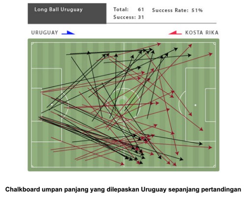 Chalkboard di bawah ini memperlihatkan arah tendangan gawang yang dilepaskan Fernando Muslera serta banyaknya umpan panjang yang dilepaskan para pemain Uruguay di sepanjang pertandingan.