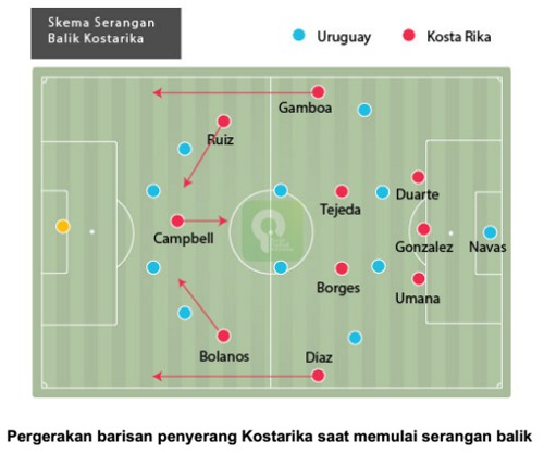 Di sisi lain, Kosta Rika berhasil memanfaatkan setiap kelemahan yang dimiliki Uruguay. Kecepatan yang dimiliki para pemainnya bukan sekedar digunakan secara sporadis tanpa rencana. Setelah gelandang Uruguay mulai terpancing naik, Joel Campbell langsung memanfaatkan ruang di belakang kedua gelandang bertahan Uruguay.